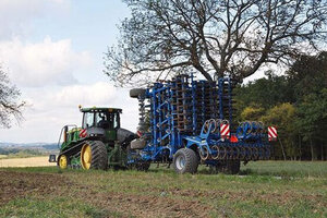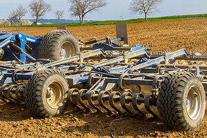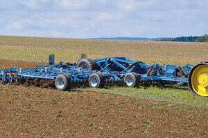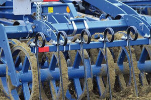 Находящийся впереди орудия гидравлически регулируемый планировочный щит Levelboard служит для выравнивания почвенного горизонта по всей ширине машины. На тяжелых почвах разбивает большие комья до того, как стойки начинают свою работу.